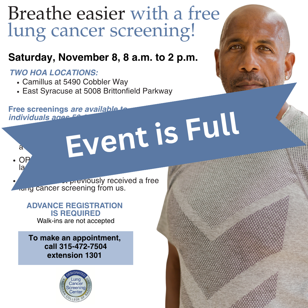 Anyone who meets the above criteria can contact HOA’s Lungs for Life Program at 315.472.7504 to arrange a lung cancer screening at a time convenient for them. The Lungs for Life Program is a lung cancer screening scan and appointment with a healthcare provider to review results and recommendations. In most cases insurance will pay for the testing. It can also be paid out-of-pocket for approximately $250.